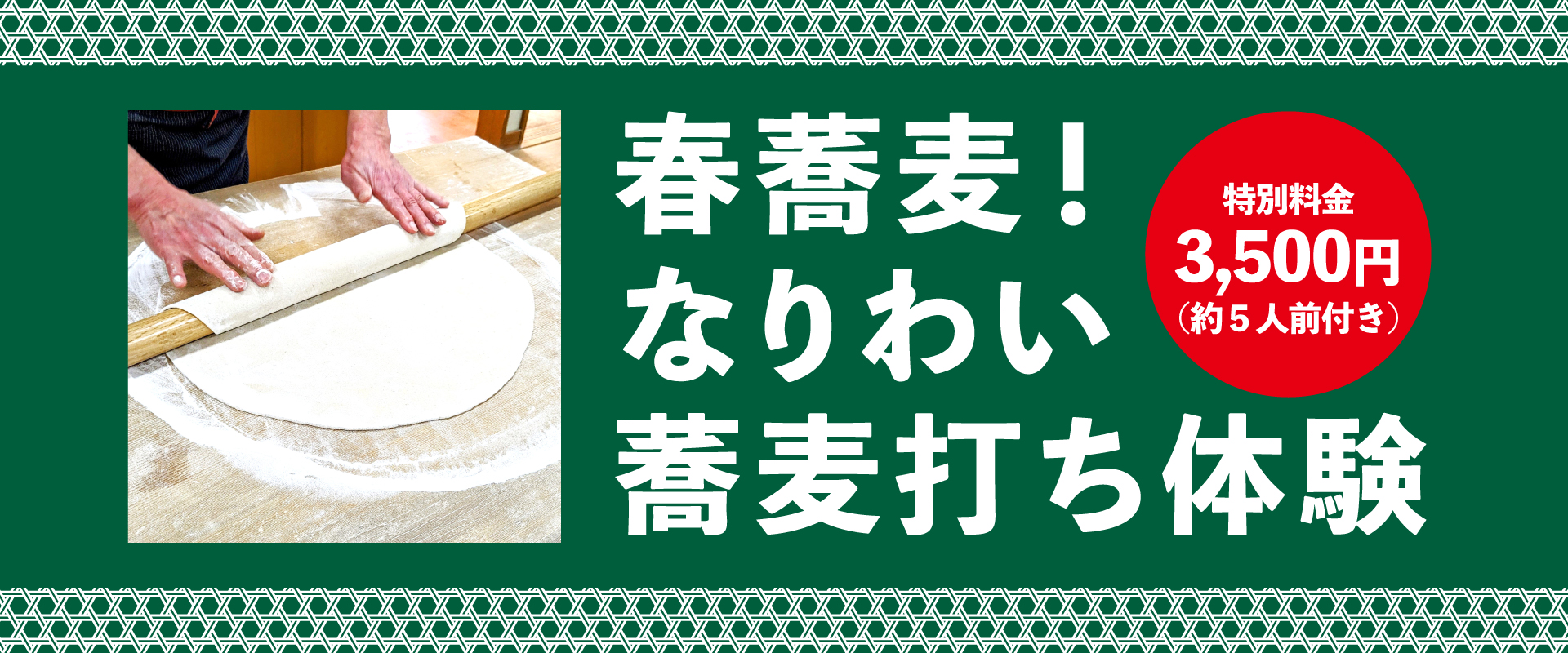 香り高い蕎麦粉を使って、自分だけの“手打ち蕎麦”を作りましょう。そば粉一筋110余年の久津間製粉久津間社長が厳選した蕎麦粉で打ち立ての蕎麦(約5人前)をお持ち帰りいただける特別な体験です。講師は久津間社長、ていねいな教え方で好評です。