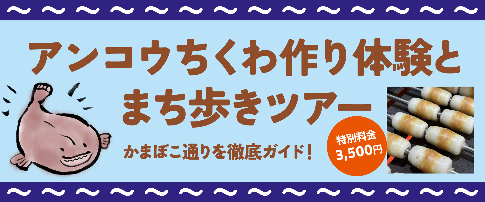 小田原漁港は日本三大深湾のひとつである相模湾に面し、魚種が豊富でアンコウも獲れます。今回は未利用部位であったアンコウの皮を活用したアンコウちくわ作りを体験するツアーをご用意しました。1830年創業以来、小田原かまぼこを伝承している伊勢兼商店での体験です。かまぼこ通りも徹底ガイドします。